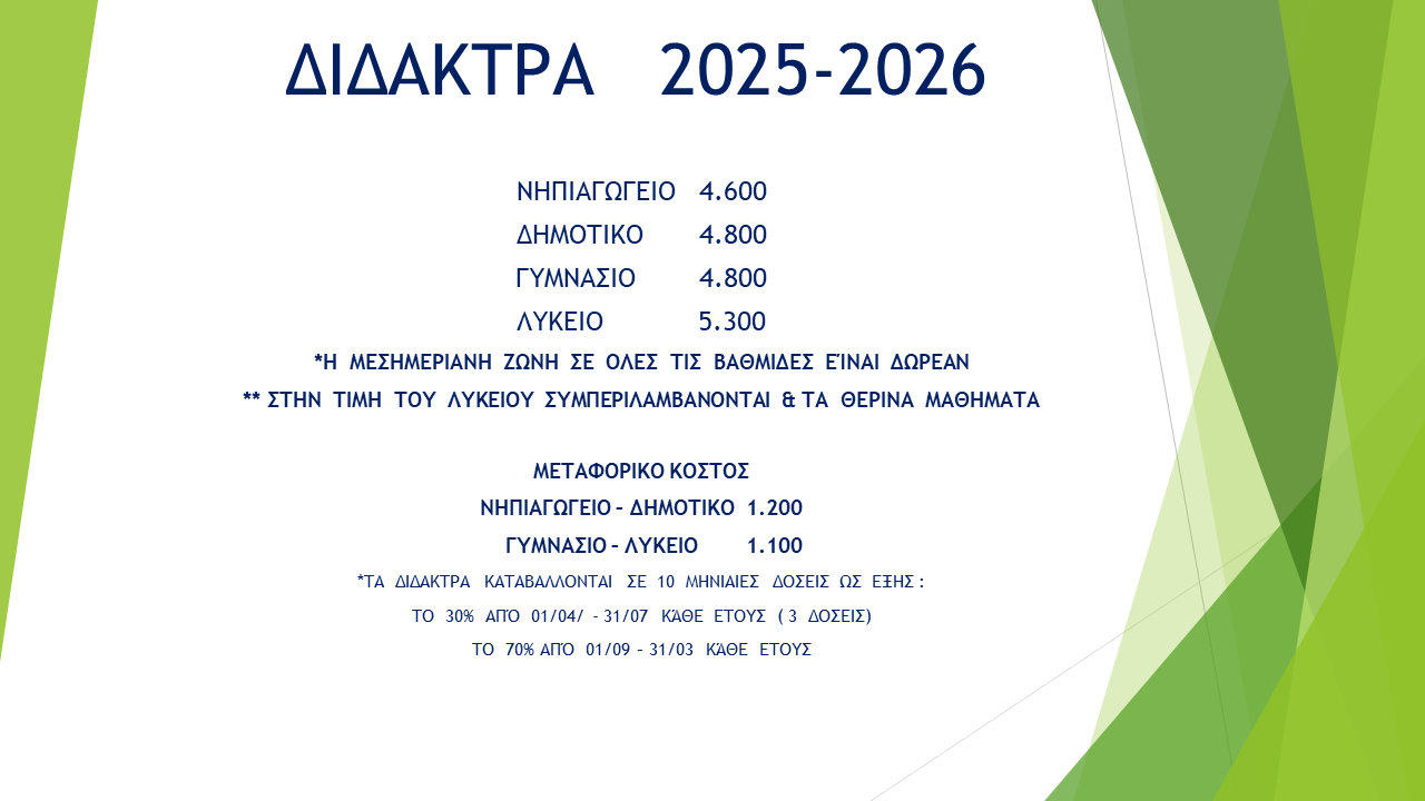 Τα δίδακτρα στα σχολεία μας είναι προσαρμοσμένα στην σημερινή πραγματικότητα. Στην ΑΘΗΝΑΙΚΗ ΑΓΩΓΗ & ΠΑΙΔΕΙΑ σεβόμαστε απόλυτα τις θυσίες των γονέων για να προσφέρουν στα παιδιά τους το καλύτερο δυνατό.